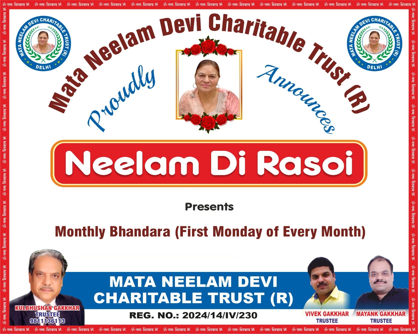 Mata Neelam Devi Charitable Trust organise Monthly Bhandara on First Monday of Every Month at Different Locations. Come and Join us for better Cause.